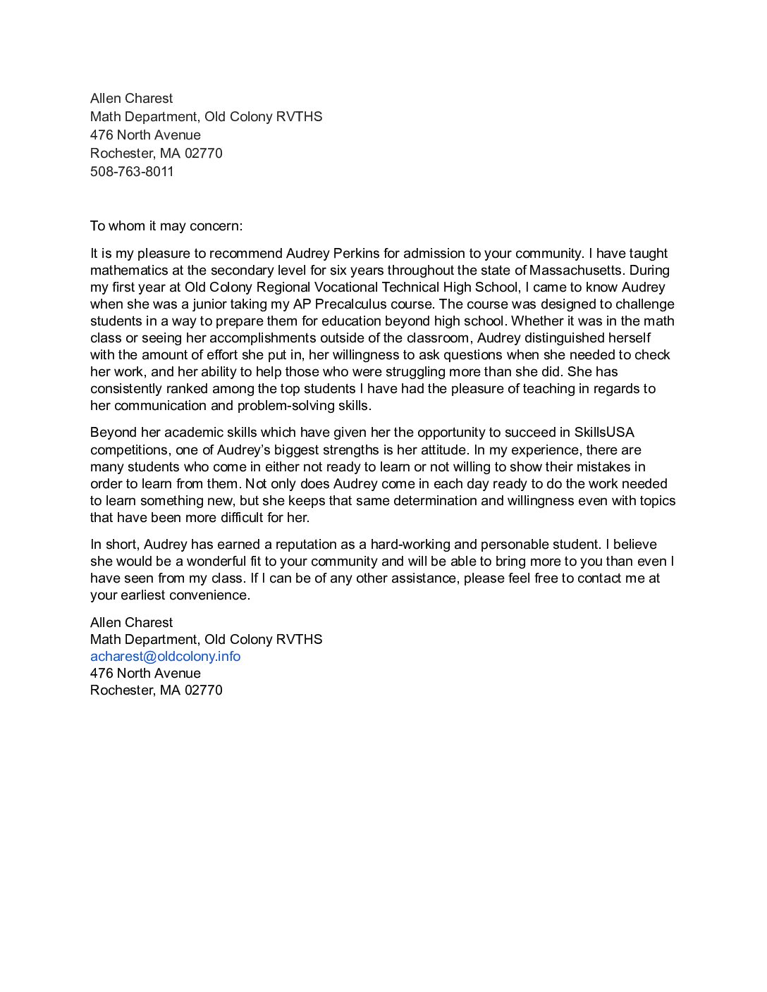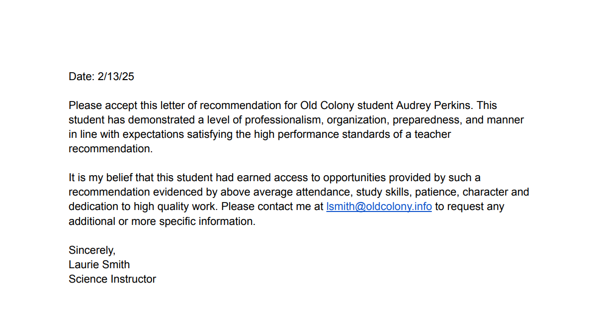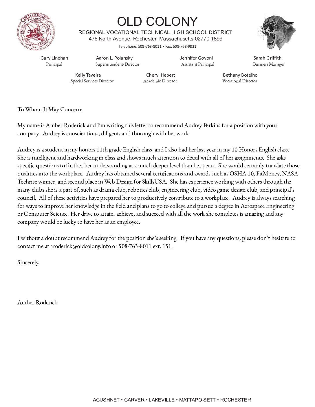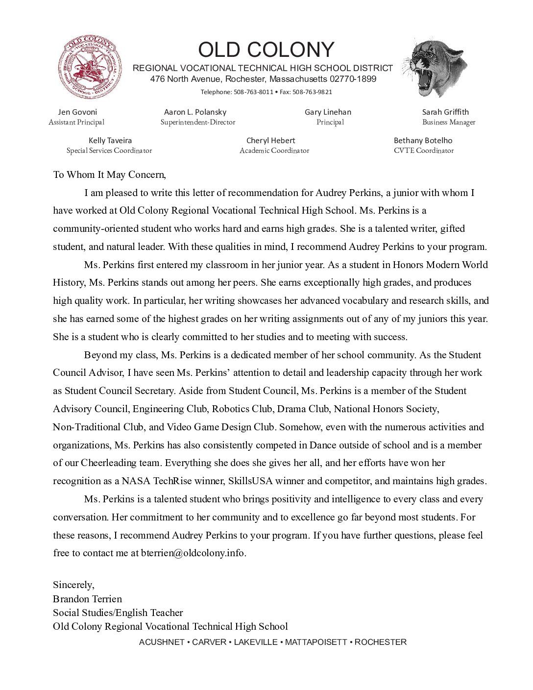 Letters of Recommendation View the letters of recommendation from my teachers/mentors Mr. Terrien: Honors World History Ms. Roderick: Honors English 10/11 Mr. Charest: AP Pre-calc/ Calc AB Ms. Smith: AP Environmental Science, Honors Biology